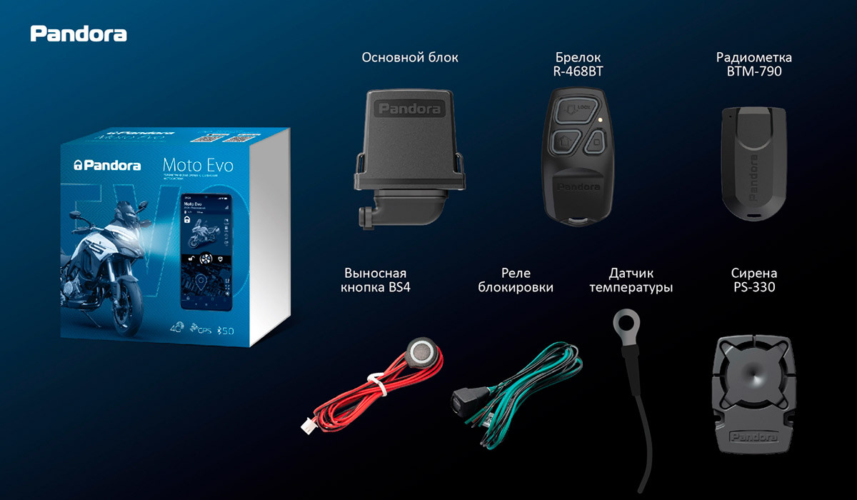 Мотосигнализация Pandora MOTO EVO v2 оснащена всем необходимым для надежной защиты и полного контроля над мототехникой на любом расстоянии.